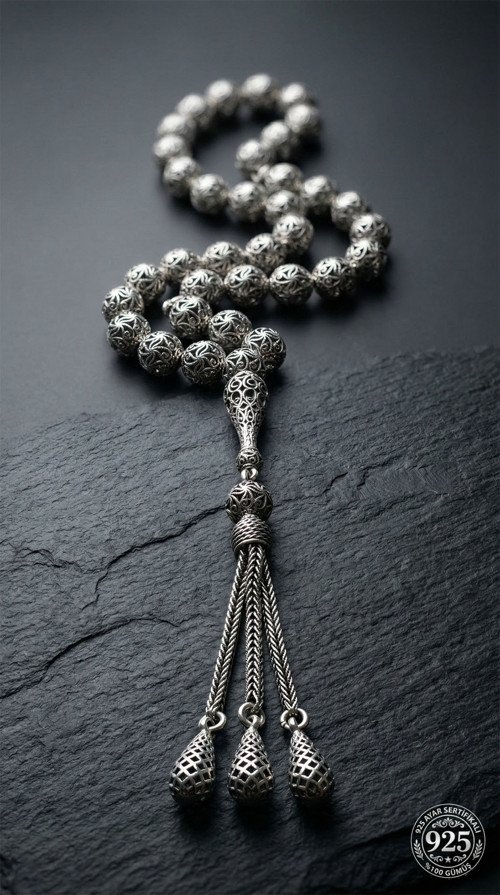 *Ürünün Tüm parçaları (Habbe, İmame, Püskül, Zincir ve tüm baglantı elemanları ile birlikte) 925 ayar sertifikalı gümüşten imal edilmiştir.