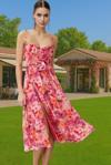 Bu nefes kesici A-kesim elbise, özel günlerinizde göz alıcı görünmenizi sağlayacak şekilde tasarlandı. Şifon kumaşın zarif akışı ve canlı çiçek desenleri, feminenliğinizi ön plana çıkarırken, kalp yaka detayı ve ince askılarıyla romantizminizi yansıtır. Gül detayı ile süslenmiş bel kısmı, silüetinize kusursuz bir vurgu yapar.