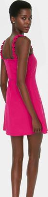 Bu göz alıcı fuşya mini elbise, yaz aylarının enerjisini ve şıklığını yansıtır. A-kesim kalıbı ile vücuda mükemmel uyum sağlar ve rahat bir kullanım sunar. Finike dokuma kumaşının kaliteli dokusu, size üstün bir konfor ve şık bir görünüm sağlar. Kare yaka tasarımı, feminen bir hava katarken, fırfırlı detaylar elbiseye hareketlilik ve canlılık getirir. Bu elbise, hem gündüz kombinlerinizde hem de gece davetlerinizde göz alıcı bir seçenek olacaktır.
