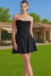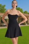 Yüksek kaliteli 87% polyester ve 13% elastan karışımı, elbisenin dayanıklılığını ve uzun ömürlülüğünü garanti eder. A-kesim kalıp, vücut tipinize mükemmel uyum sağlayarak kusursuz bir siluet oluşturur. Straplez yaka detayı, omuzlarınızı ve boynunuzu zarifçe sergilerken, mini boyu da bacaklarınızı olduğundan daha uzun gösterir. Finike dokuma kumaş, hem şıklığı hem de konforu bir arada sunar.
