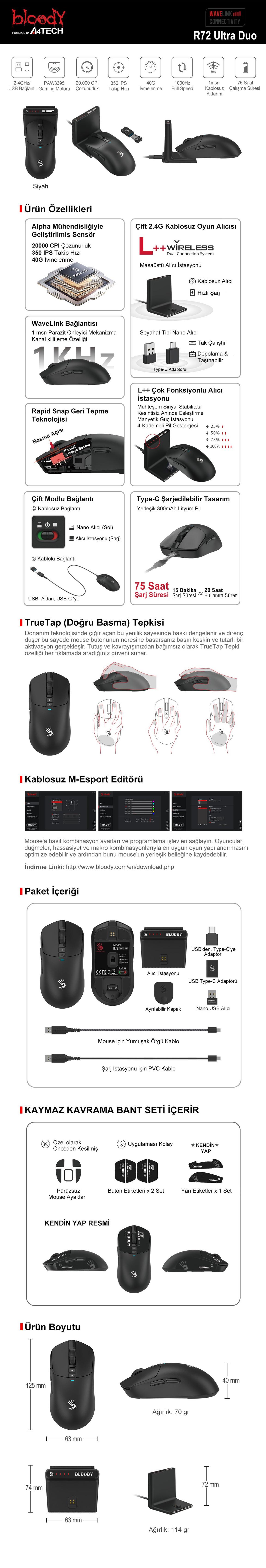 A4-Tech Bloody R72 Ultra Duo 20K Kablosuz Şarj Edilebilir Gaming Mouse