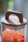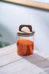 Kompakt formuyla baharatlar, çay veya kuru meyveler için ideal olan bu küçük boy cam kavanoz, 16.5 cm yüksekliğiyle dolap içi veya açık raflarda şık bir düzen sağlar. Doğal akasya kapağı hem dekoratif hem fonksiyonel; mutfağınıza sıcaklık ve düzen kazandırır.