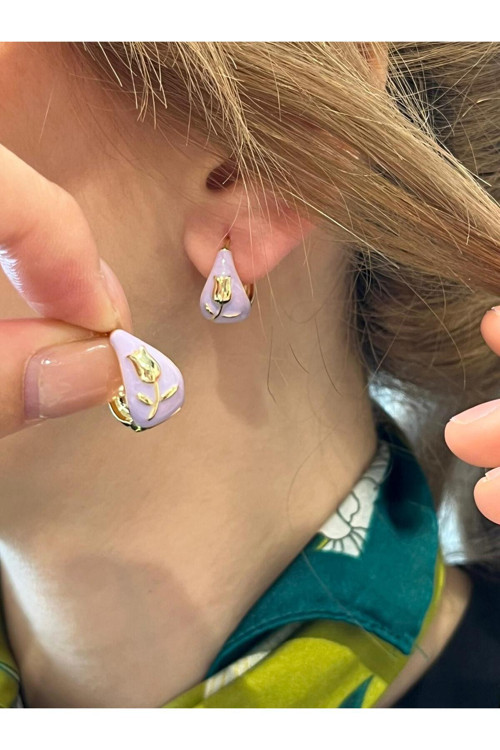 - Zarif tasarımıyla dikkat çeken lila renkli altın sarısı lale detaylı küpeler, günlük kullanım için idealdir.