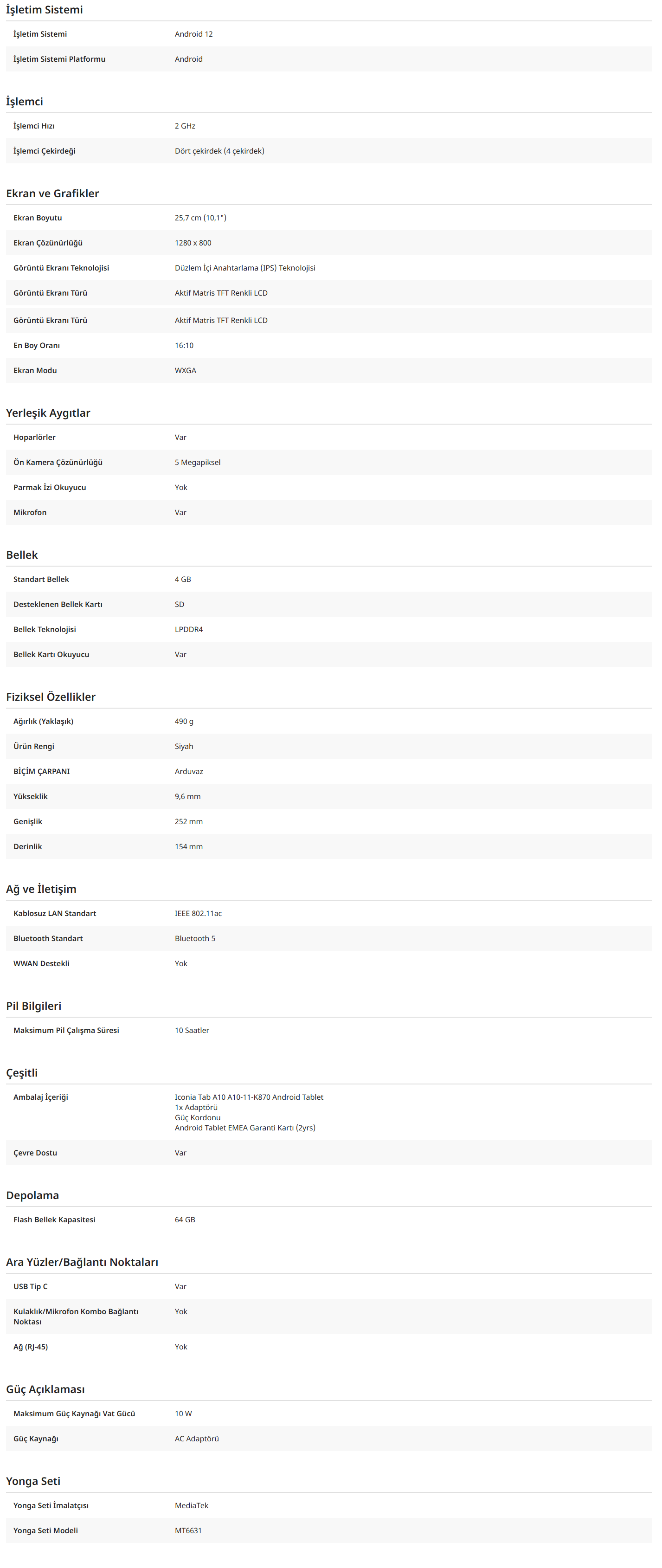 - MediaTek işlemci tipi, günlük kullanım için yeterli performans ve hızlı yanıt süreleri sunar