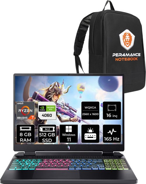Acer Nitro 16 R7 8845HS 8GB 512GB SSD RTX4060/8GB 165Hz WQXGA 16" W11H Gaming Laptop