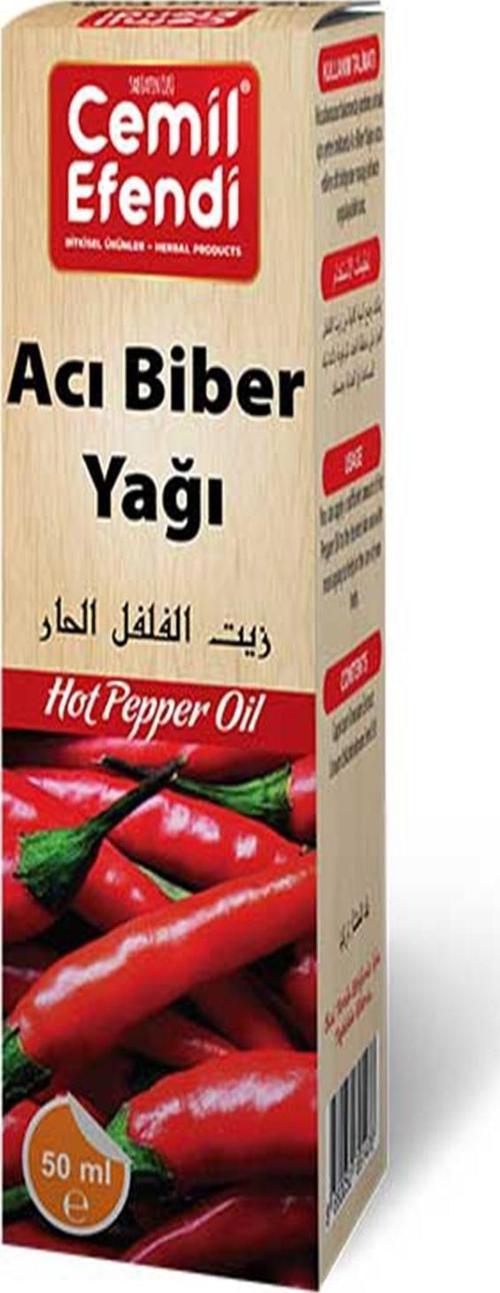 | Acı Biber Yağı 50 Ml. İçindekiler Capsicum Annuum Extract, Linum Usitstissimum Seed Oil. Kullanım Talimatı Vücudunuzun bakımında yardımcı olmak için yeterli miktarda Acı Biber Yağını arzu edilen cilt bölgesine masaj şeklinde uygulayabilirsiniz. Uyarılar Serin yerde, ağzı kapalı olarak muhafaza ediniz. Çocukların ulaşamayacağı yerde saklayınız. Göz ile temasından kaçınınız. Teması halinde bol su ile durulayınız. I şıktan koruyunuz. Harici kullanım içindir. |
