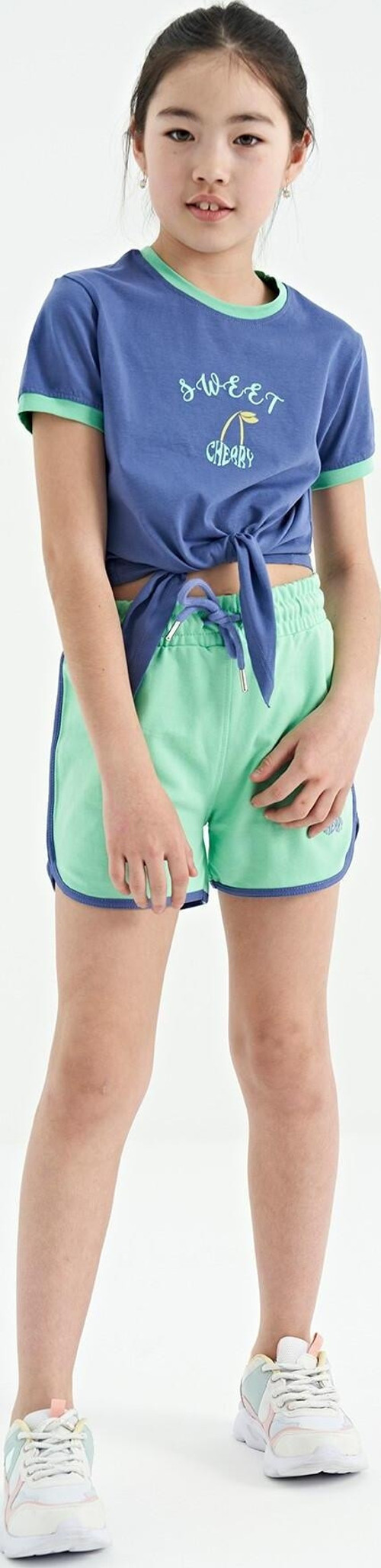 Tommy Life Açık Eflatun - Su Yeşil O Yaka Baskılı Düğüm Detaylı Rahat Kalıp Kız Çocuk Şort Takım - 75132