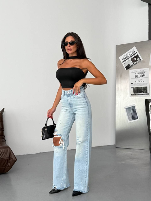 Açık Mavi Yırtık Detaylı Yüksek Bel Bol Paça Jean
