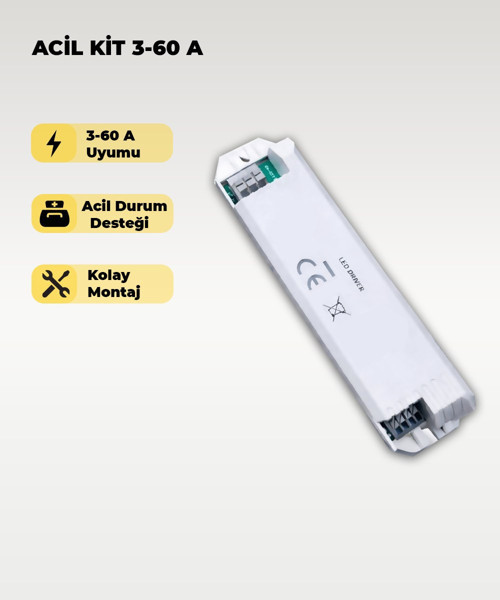 Acil Kit 3-60A, elektrik kesintilerinde iç mekân aydınlatmasının kesintisiz devam etmesini sağlamak üzere tasarlanmış profesyonel bir acil durum güç destek modülüdür. Özellikle LED spot armatürler ile uyumlu yapısı sayesinde ofisler, hastaneler, oteller, mağazalar, konutlar ve ticari alanlarda güvenle kullanılır.