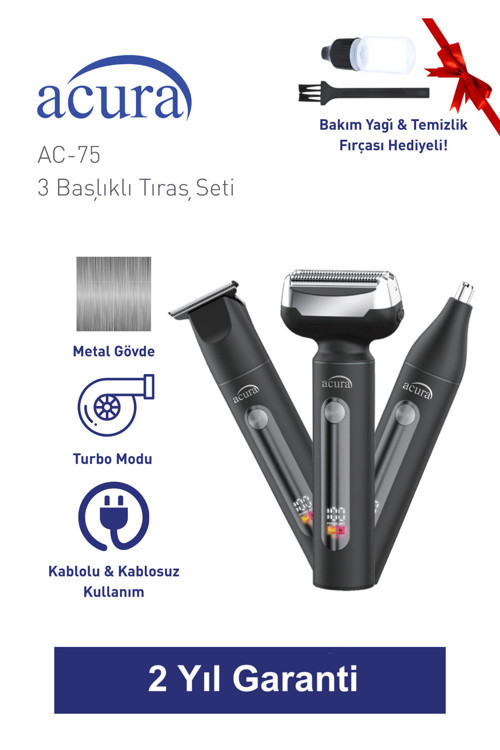Acura AC-75 3 Başlıklı Metal Gövdeli Tıraş Seti