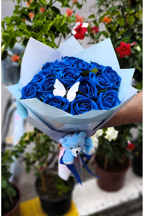 Aden Çiçek Evi 15'Li Kadife Mavi Gül Buketi Kelebekli & Ayıcıklı Sevdiklerinize Özel Gün Hediyesi