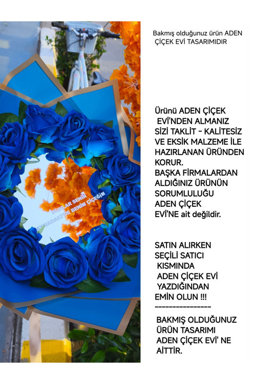 - 20 cm çapında aynalı mavi kadife gül buketi, dekoratif ve şık bir dokunuş sunar.; - 12 adet kadife gül ile dolu bu buket, göz alıcı bir görünüm sağlar ve her ortamda dikkat çeker.; - Türkiye'de üretilen bu ürün, yerel işçiliği destekler ve kaliteli malzemelerle özenle hazırlanmıştır.; - Aden Çiçek EVi tarafından üretilen bu ürün, markanın kalitesini ve güvenilirliğini yansıtır.; - Birincil ithalatçı Aden Çiçek EVi, ürünün orijinalliğini ve müşteri memnuniyetini garanti eder.