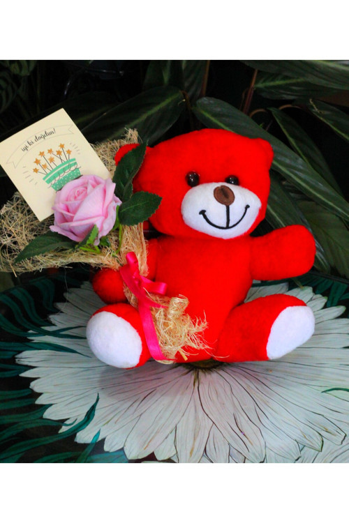 Aden Çiçek Evi Elinde Kadife Gül & İyi Ki Doğdun Kartı Tutan 25Cm Peluş Ayı Sevdiklerinize Özel Gün Hediyesi