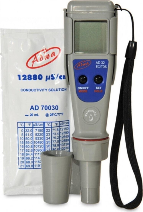 Uygun fiyata alabileceğiniz üstün kalitede bir EC ve TDS metre. Ucuz alternatifleri ile karşılaştırmayınız. Pakete 20 ml lik 12.88 mS/cm kalibrasyon sıvısı dahildir. Su geçirmezdir. Boyutlar ve Ağırlık - Boyutlar 175 x 39 x 23 mm Ağırlık 100 gr. Genel - Marka ADWA Model AD32 Kullanım alanları İletkenlik, TDS ve sıcaklık ölçümü Özellikler - İletkenlik ölçüm aralığı 0,00 ~ 20,00 mS/cm TDS ölçüm aralığı 0,00 ~ 10,00 ppt Sıcaklık ölçüm aralığı 0 ~ 60ºC (32 ~ 140ºF) Hassasiyet 0,01 mS/cm