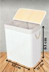 ölçüleri boyu 52 cm - eni 32 cm - yükseklik 63 cm ölçülerindedir. 50 lt.+ 50 lt. = 100 Litre Kapasitelidir.Bambu malzemeden üretilmiştir. Katlanabilir gövde kolay kapak kullanımı uzun ömürlü neme suya buhara küflenmeye dirençlidir. Yıkanabilir ve kolayca bir yerde diktirilir iç bezden oluşmaktadır. bambu kısmı nemli sirkeli bez ile nazikçe silinebilir. Bambu Ağacından Tasarlanmış olup Çok amaçlı kullanıma uygundur. Rengi doğal bir üründür . Bambu malzeme hijyenik bir malzeme olup Bakteri barındırmaz bakterileri yok etme özelliği sayesinde uzun ömürlüdür. Slim görüntüsü banyonuza yada kullanım alanınızda oldukça zariflik ve şıklık katan tasarım ürünüdür.Bambu ürünler özellik olarak ise toprağın altındaki kalın yapıda bulunan gölgesinden dallanıp budaklanarak büyüyen bambu bitkisi, 10 santimetrelik boylarından 40 metre uzunluğuna varana kadar ulaşabilen bambu ağaçlarını aynı tür içerisinde barındırmaktadır. Yaprakları şerit biçiminde olan bu bitkinin yaprakları da genç yaşta olan bambularda gövdenin üzerinden yaşlı bambulardaysa dalların üzerinden çıkmaktadır. Bazı türlerinin 120 yıla kadar yaşadığının görülmesinden ötürü bambu için uzun ömürlü bir bitki denilebilmesi mümkündür. Diğer sert ağaç türlerine karakteristik yapı adı altında benzerlik gösterebilmektedir. Dış görünüm açısından sade ve canlı bir güzelliğe sahip olan bambuların, günümüz dünyasında pek çok çeşit alanda aranan bir malzeme olduğu ve sıklıkla kullanıldığı bilinmektedir. Bambu-bitkisi Bakterileri kendi kendine yok etme özelliği et kesme tahtalarında,banyo alanlarında kullanılan aksesuarlarda tercih nedenidir. Ayrıca bu bitkiye mistik bir anlam da yüklenmiş ve kendisinin dayanıklılığı, esnekliği ve gücü sembolize ettiğine inanılmıştır. Çünkü bu bitkinin topraktan yetişip filiz vermesi (bazen yılları bulabilmektedir) ve filizlenmesinin ardından çok güzel ve hızlı bir büyüyüş süreci geçirdiği gözlemlenmiş ve kendisine böyle bir anlam ithaf edilmiştir