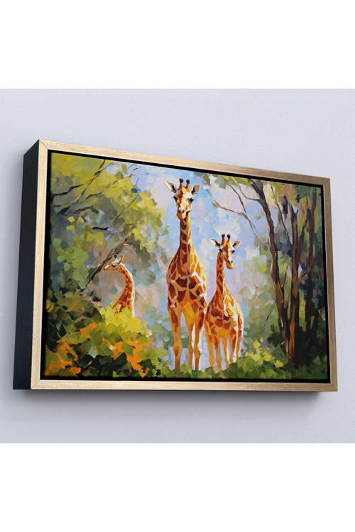 Ahşap çerçeveli Ormandaki Ağaçların Altında Dinlenen Zürafa Aile Tablosu-7228
