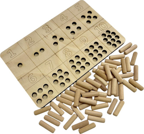 - Plakanın üst bölümünde 1’den 10’a kadar sıralanmış sayılar, alt bölümünde ise her sayıya karşılık gelen delik sayısı yer alır. Yanında gönderilen ahşap çubuklarla çocuklar sayı kadar delik doldurarak aktif şekilde öğrenmeye katılırlar.