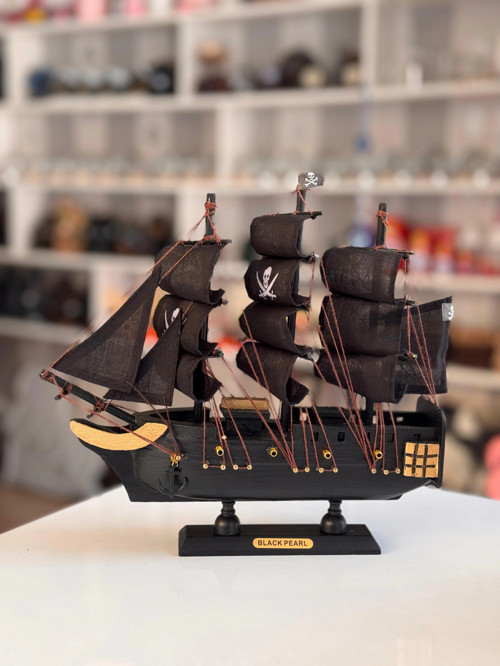 Detaylı ahşap gövdesi, siyah yelkenleri ve korsan bayraklarıyla gerçekçi bir görünüm sunar.