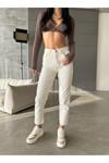 Trend bir görünüm sunan bej renkli mom jeans, günlük kullanıma uygun şık bir seçenek olarak öne çıkıyor.
