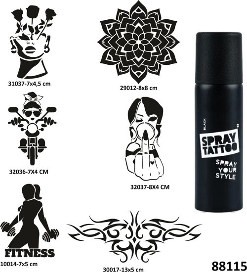 Siparişinizle birlikte 1 tüp 50 ML Spray Tattoo Geçici Dövme Spreyi ve resimde görünen dövme şablonları hediye gönderilir. 1 Tüp sprey ile desen büyüklüğüne göre ortalama 15-20 arası dövme yapılır, şablonları 2-3 defa tekrar kullanabilirsiniz. Dövme sayısı desenlerin büyüklüğüne ve spreyi kullanımınıza göre değişkenlik gösterir.