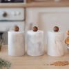 Mermer baharatlığın yüksekliği 12 cm çapı ise 9 cm\'dir Kapağın üzerinde 3 cm ahşap kulp bulunmaktadır. Set içinde 3 adet baharatlık ve 30x14 cm ölçülerinde 1.8 cm kalınlıkta ahşap ayaklı sunumluk bulunmaktadır.