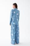 Gecenin yıldızı sen ol! Mavi tonun huzurunu, beyaz yıldız desenleriyle buluşturan bu düğmeli pijama takımı, evde geçirdiğin her ana pozitif enerji katıyor. Yumuşacık pamuklu kumaşı sayesinde tenine nefes aldırır, konforu şıklıkla birleştirir.