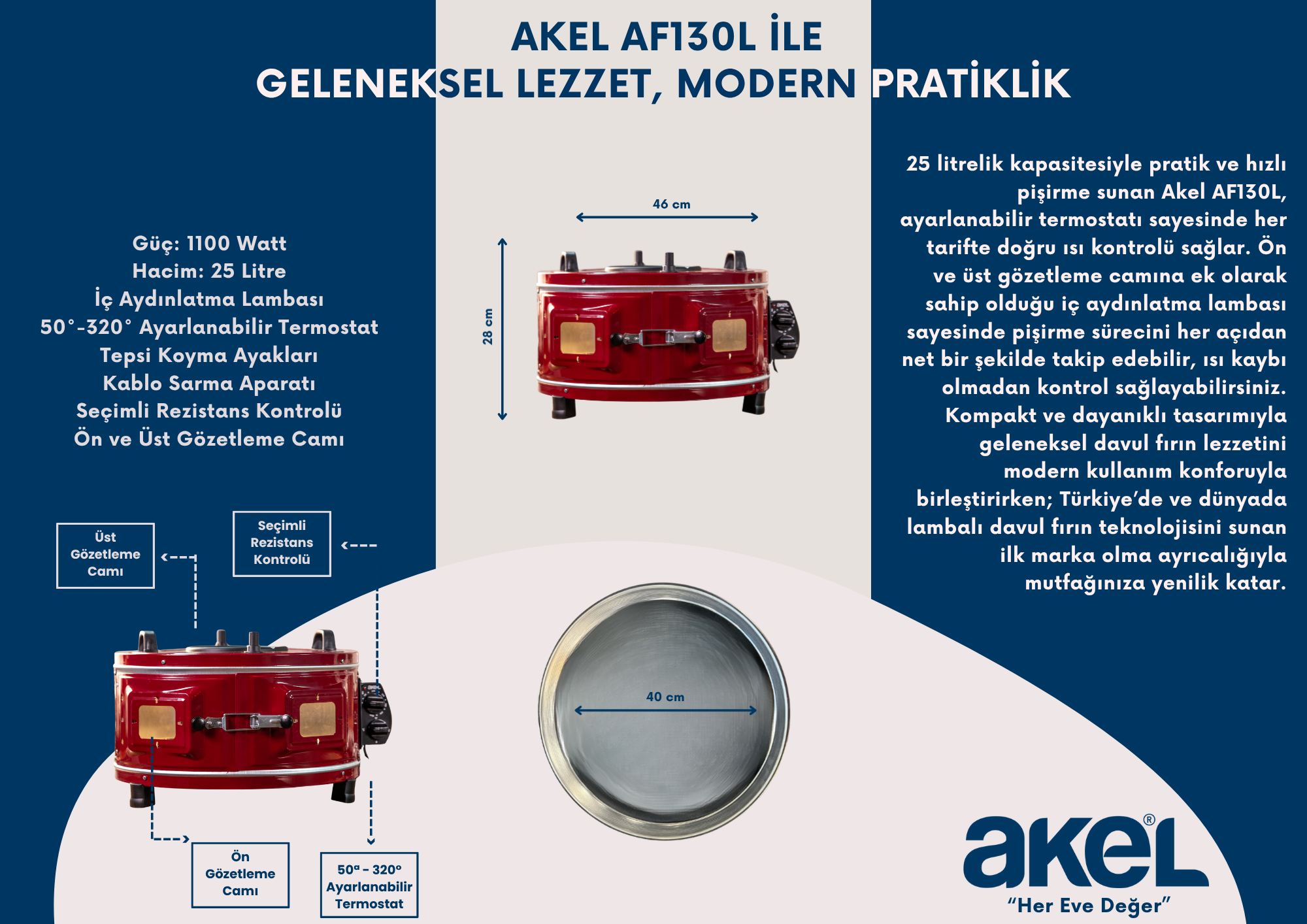 Akel AF130L Orta Boy Yuvarlak Davul Fırın, Türkiye’deki ilk ve tek lambalı davul fırın olarak yemeklerinizi mükemmel şekilde pişirmenizi sağlar. 50°-320° ayarlanabilir termostat ve seçimli rezistans kontrolü ile pişirme sürecini, ön ve üst gözetleme camları sayesinde rahatça takip edebilirsiniz.