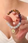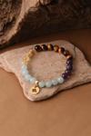 Akrep burcu doğaltaş bilekliği Akuamarin, Kunzit, Ametist, Kaplan Gözü ve Sitrin taşlarından oluşmaktadır.