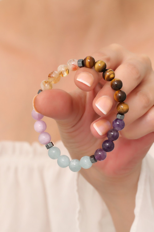Akrep burcu doğaltaş bilekliği Akuamarin, Kunzit, Ametist, Kaplan Gözü, Sitrin ve Hematit taşlarından oluşmaktadır.