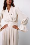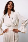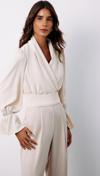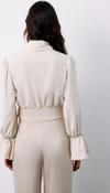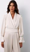 Katlı kruvaze yaka, yandan fermuarlı, arka bel gipe lastikli, kol volanlı ve aksesuarlı kısa bluz.