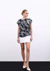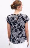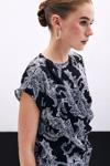 Bisiklet yaka, arka yaka düğmeli, geniş kısa kol, ön dökümlü, aksesuarlı desenli uzun bluz.