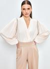 Kruvaze yaka, uzun balon kol, altan çıtçıtlı, omuzları aksesuar detaylı bodysuit bluz.