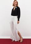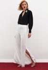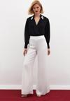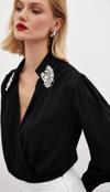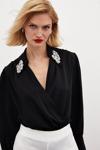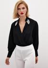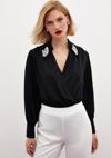 Gömlek yaka ve kruvaze, uzun manşetli kol, alt çıtçıtlı kapama, birleşik aksesuar detaylı bodysuit bluz.