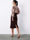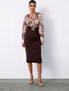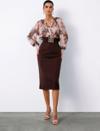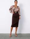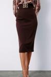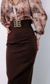 Yüksek bel, arka fermuarlı, arka yırtmaçlı, birleşik aksesuarlı kalem etek.