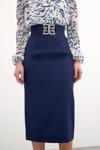 Yüksek bel, arka fermuarlı, arka yırtmaçlı, birleşik aksesuarlı kalem etek.