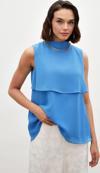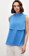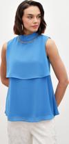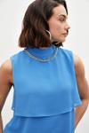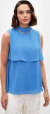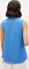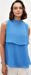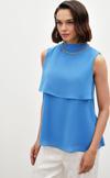 Dik yaka, kolsuz, arka yaka düğmeli kapama, astarlı, geniş kalıp, aksesuar detaylı volanlı bluz.