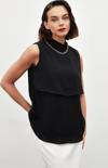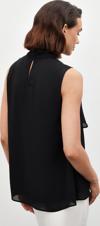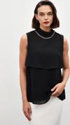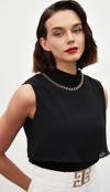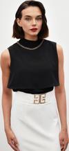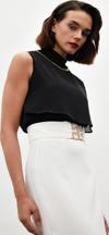 Dik yaka, kolsuz, arka yaka düğmeli kapama, astarlı, geniş kalıp, aksesuar detaylı volanlı bluz.