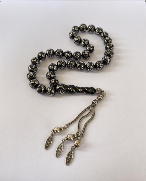 Aksesuar Tesbih TSBH0238BC 925 Ayar Gümüş Püsküllü Yoğun Gümüş İşlemeli Küre Kesim Erzurum Oltu Taşı Tesbih