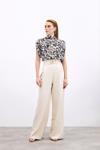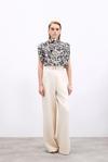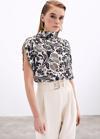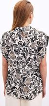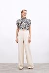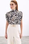 Boğazlı yaka, arka yaka düğmeli, kalça altı boy, salaş, aksesuarlı yarasa kol bluz.