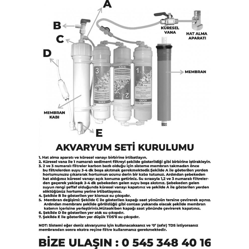 - Günlük 280 Lt Su Kapasitesi 4 Aşamalı Akvaryum Su Arıtma Sistemi Montaj Için Gerekli Tüm Bağlantı Parçaları Ile Beraber Gönderilecektir... Sadece Klorsuz Su ( Membran Kabinin Üzerindeki Vanadan) Istediğiniz Zaman Bina Girişleri Ile Ayni Akişa Sahip Olursunuz Fakat Saf Su (Membran Üzerinde Bulunan Check Valfden) Akiş Hizi Düşüktür. Klorsuz Su Aldiğinizda Atik Su Olmaz. Saf Su Çikisindan Su Alirsaniz Yaklaşik ½ Veya 1/3 Oraninda Sistem Atik Su Atar. Ürün Içeriği