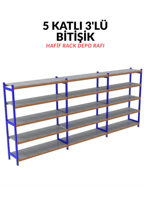 5 Katlı 3'lü Depo Rafı - 300-350 Kg Taşıma Kapasiteli Hafif Rack Raf 50x120x200 Cm