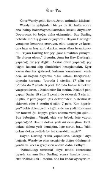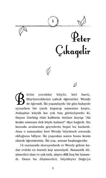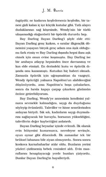 Her çocuğun düşlerini süsleyen bir Olmayanya vardır. Ve onları bu olağanüstü ülkeye götürecek bir de Peter Pan' ı. Darlinğ ailesinin üç çocugu Wendy, John ve Mıchael da bir gece Peter Pan'ın peşine takılırlar ve gökyüzünün içinden süzülerek Olmayanya'yı keşfe çıkarlar. Burada kayıp çocuklarla tanışırlar, Kızılderililerle, kurtlarla, deniz kızlarıyla karşılaşırlar. Korsanların uğursuz lideri Kaptan Hook'la savaşırlar. Pek çok nefes kesen macera yaşadıktan sonra bir gece yine evlerinin penceresinden süzülerek içeri girerler. Bundan sonra çocukların başına neler geldiğini, Wendy ve Peter Pan' ı nelerin beklediğini merak ediyorsanız, elinizdeki kitabın sayfalarını çevirmeye başlayın.
