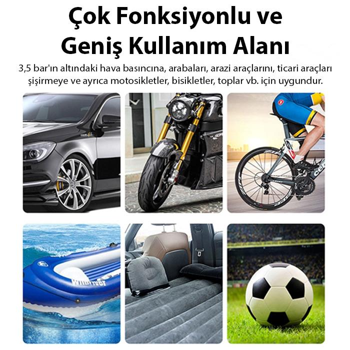 Otomobilleri, motosikletleri, bisikletleri, topları ve şişirilmesi gereken diğer ekipmanları şişirmek için kullanılabilen bir dizi şişirilebilir nozul ile donatılmıştır.