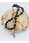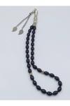 Üretildiği malzeme: Ateş kehribar Ana renk: Siyah Lacivert İmame maddesi: Alpaka Tane ölçüsü: 8x12 Toplam uzunluk: 31 cm Ağırlık: 26 gram;