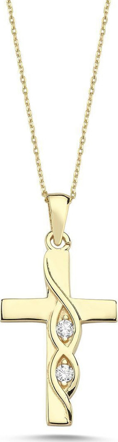 14 ayar altın 1.79 gram 2 x 1.3 cm ebatında 45 cm zincir uzunluğunda zirkon taşlı özel tasarım haç kolye.