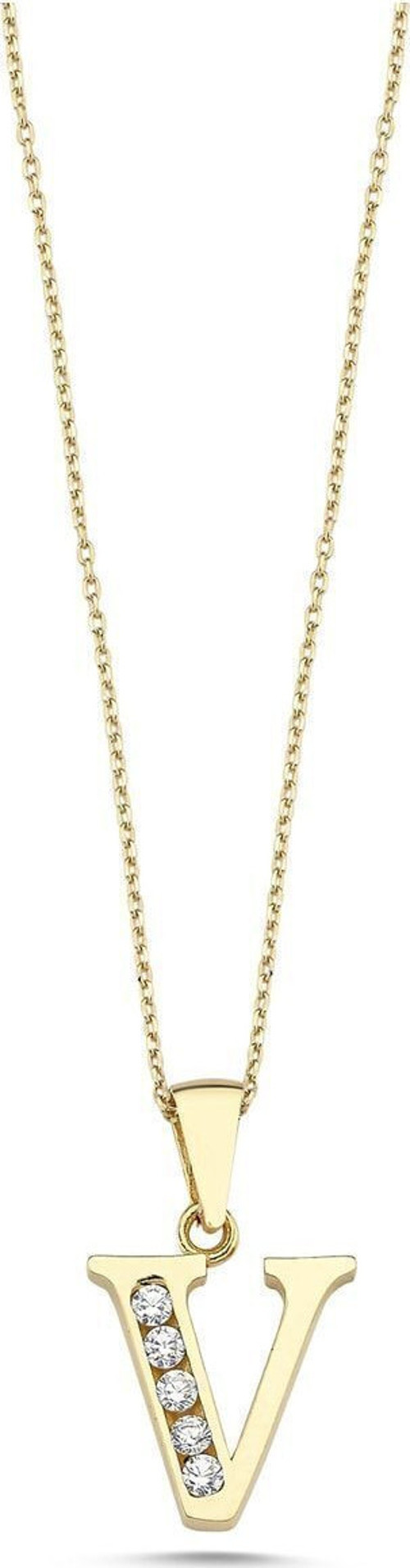 14 ayar altın 1.50 gram 45 cm zincir uzunluğunda 1 cm ebatında zirkon taşlı V harfi kolye. Tam ayar garantilidir.