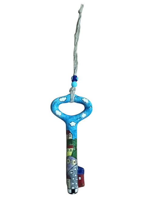 - El emeği göz nuru tasarımıyla dikkat çeken bu çini şans anahtarı, modern dekorasyon anlayışınıza eşsiz bir dokunuş katıyor.; - Yüksek kaliteli seramik malzemeden üretilmiş olup, uzun ömürlü kullanım sunar.; - Tek parça halinde gelen bu ürün, kolayca monte edilebilir ve mekanınızda hemen yerini alabilir.; - Canlı mavi rengiyle odanızın atmosferine neşe katar ve şans getirdiği söylenen bu anahtarla evinizdeki enerjiyi yükseltin.; - Altıntaş Çini tarafından üretilen bu ürün, Türkiye'nin zengin kültürel mirasını evinizin her köşesine taşıyor.; - 8 cm genişliğinde ve 18 cm yüksekliğindeki boyutlarıyla ideal boyutta olan bu şans anahtarı, hem estetik hem de fonksiyonel bir aksesuar olarak öne çıkıyor.