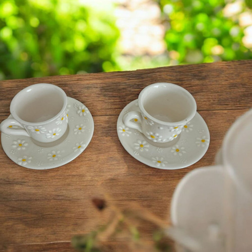 - El yapımı papatya desenli ikili fincan seti, klasik tasarımıyla her sofraya şıklık katar.; - Seramik malzemeden üretilmiş olup, dayanıklılığı ve estetik görünümüyle dikkat çeker.; - Set içerisinde 4 parça bulunmaktadır; 2 adet fincan ve 2 adet tabak, ideal ikili kullanım için tasarlanmıştır.; - Her bir fincan 60 ml hacme sahiptir, günlük kullanım için ideal miktarda içecek kapasitesi sunar.; - Beyaz ve sarı renklerin zarif uyumu, göz alıcı bir görünüm sağlar ve mutfak dekorasyonunuza renk katmak için mükemmeldir.; - 2 kişilik kullanım için uygun olan bu set, özel anlarınızı sevdiklerinizle paylaşırken konforlu bir deneyim sunar.; - Elde yıkanması önerilen bu ürün, uzun ömürlü kullanım için bakım talimatlarına uyulmasını gerektirir.; - Türkiye'de üretilmiş olan bu fincan seti, yerel üretim desteklenerek kalitesinden ödün vermeden sunulmaktadır.; - Altıntaşçini markasının güvencesiyle üretilen bu ürün, müşteri memnuniyetine önem veren bir