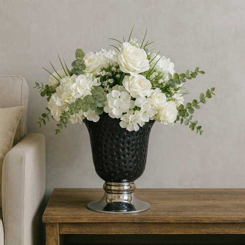 Siyah dokulu vazo ve krom kaide üzerinde beyaz güller, ortancalar ve okaliptüslerle hazırlanan şık aranjman. Salon konsolu, TV ünitesi ve orta sehpa için hazır, bakımsız dekor.