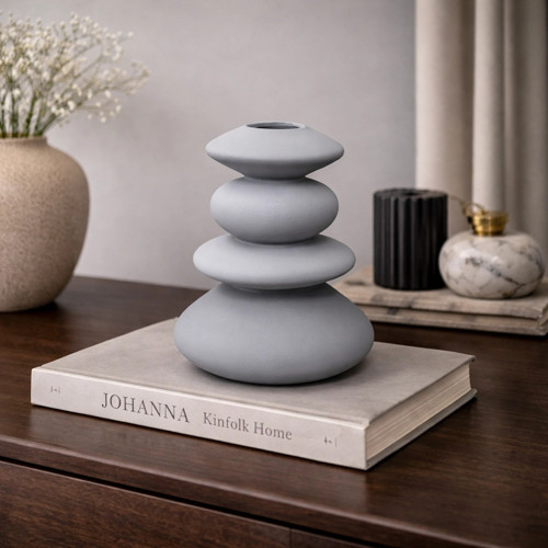 Üst üste taş görünümünde, zen formunda, mat gri seramik dekoratif vazo. Doğal ve sade dekorasyonlar için huzur veren bir detay.